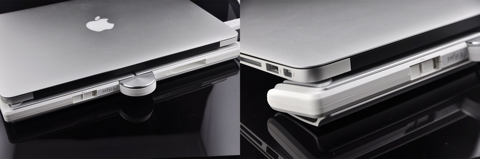 Zyfer 2 has a huge leap in heat dissipation comparing to its previous version. By creating double air flows consistently. Its aluminum body shapes two tunnels as a radiator. Air exchanging heat after sucked in and pass through the tunnel then was pressed into higher speed, blow toward laptop to carry away the heat from the laptop.